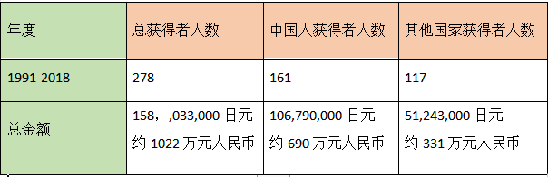 奖学金获得者人数一览表(1991年~2018年度)