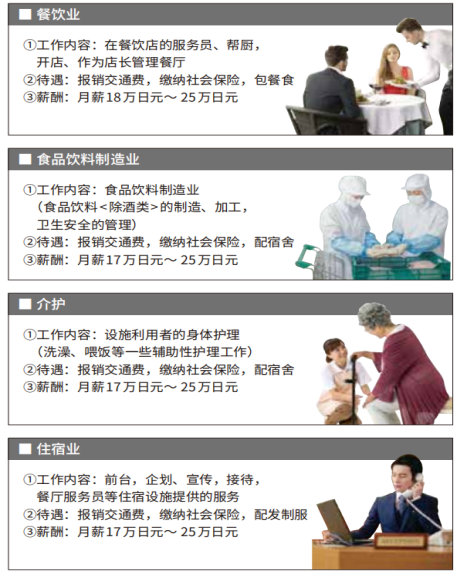 5.从事工作:酒店住宿业、食品饮料加工业、餐饮业、介护业等14种行业。