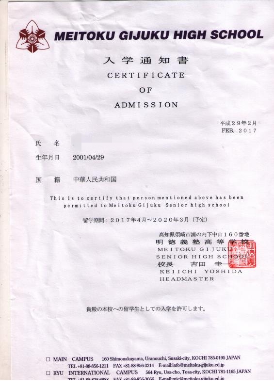 日本高中录取通知书